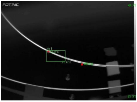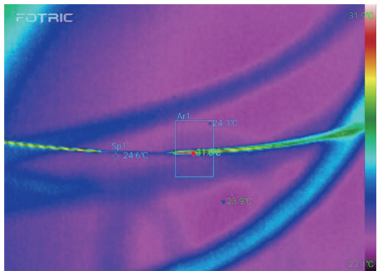 光纖來(lái)料檢測(cè)時(shí)用激光器打入激光,如果有鍍膜破損的地方會(huì)漏光產(chǎn)生高溫,使用FOTRIC熱像儀就可以快速查看整個(gè)光纖表面是否有鍍膜破損的情況,確定設(shè)備的缺陷點(diǎn),提高檢查效率,保障設(shè)備的安全。