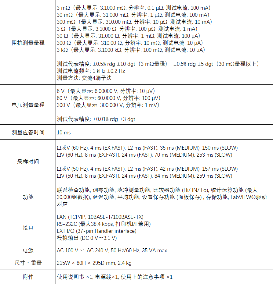 ●同時測試內(nèi)部阻抗和開放型電壓●用于測試xEV大型電池、300 V以下的中型電池組的測試●內(nèi)部阻抗(AC-IR)測量量程: 3 mΩ/30 mΩ/300 mΩ/3 Ω/30 Ω/300 Ω/3 kΩ●開放型電壓測量量程: 6 V/60 V/300 V●接口搭載LAN