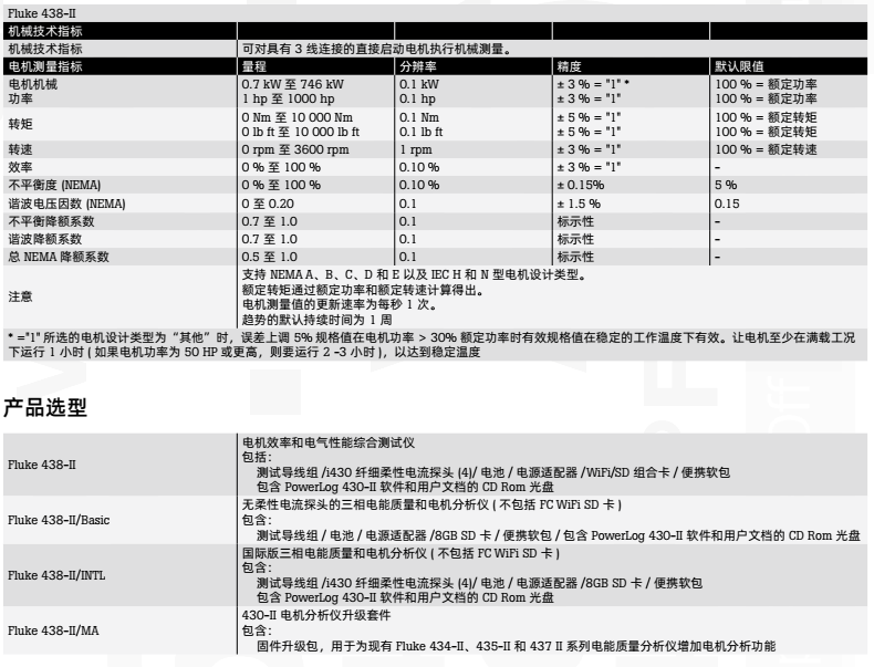 Fluke 438-II 電機(jī)效率和電氣性能綜合測(cè)試儀不僅具備 Fluke 435 II 系列電能質(zhì)量分析儀的先進(jìn)電能質(zhì)量分析功能,而且新增了電機(jī)機(jī)械測(cè)量重要功能。無(wú)需使用機(jī)械傳感器即可快速輕松地測(cè)量和分析電能、諧波、不平衡度、電機(jī)轉(zhuǎn)速、轉(zhuǎn)矩和機(jī)械功率等關(guān)鍵機(jī)電性能參數(shù)。通過(guò) Fluke-438-II/MA 電機(jī)分析儀升級(jí)套件,F(xiàn)luke 434-II、435-II 和 437-II 電能質(zhì)量分析儀的用戶(hù)可為其現(xiàn)有設(shè)備增加電機(jī)分析功能。438-II 使用來(lái)自 NEMA 或 IEC 額定電機(jī)的電機(jī)額定值板的數(shù)據(jù)幫助計(jì)算機(jī)械參數(shù)。