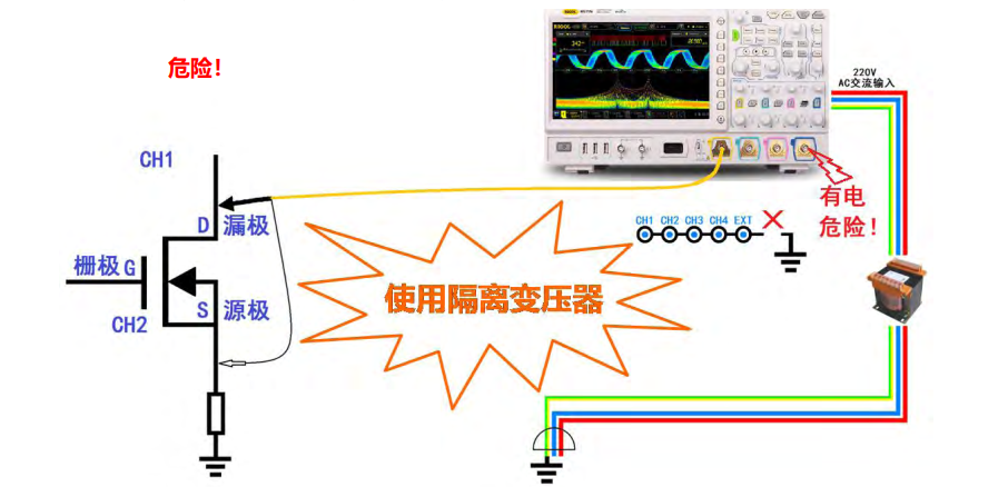 正確安全的浮地測試必須使用差分探頭,剪斷示波器地線或使用隔離變壓器供電的方法是錯誤和危險的!