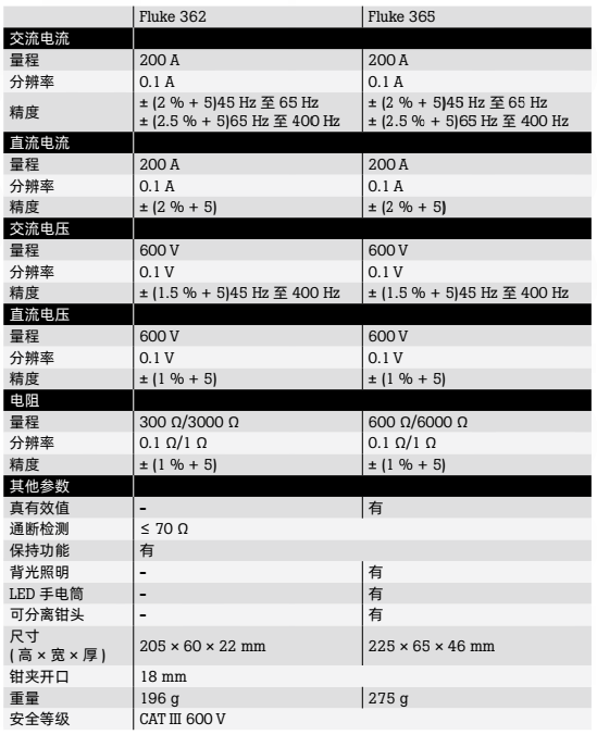 ● 緊湊型設計,可以單手操作● 200 A 交 / 直流、600 V 交 / 直流電壓量程● 3000 Ω(Fluke 362) / 6000 Ω(Fluke 365) 電阻量程,通斷性檢測● 歸零功能,可以將顯示清零以進行直流測量● 真有效值測量,可以準確的測量非線性負載電路 ( 僅限 Fluke 365)● 讀數保持● 安全等級 CAT III 600V
