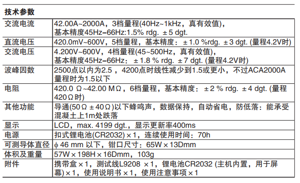 攜帶盒×1, 測(cè)試線L9208 ×1, 鋰電池CR2032 (主機(jī)內(nèi)置,用于屏幕)×1, 使用說(shuō)明書×1,使用上的注意事項(xiàng)×1