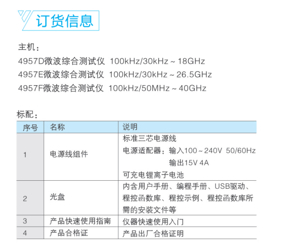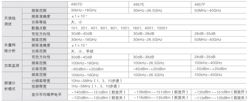 4957D/E/F微波綜合測(cè)試儀頻率范圍可達(dá)18GHz/ 26.5GHz/40GHz,集雙端口矢量網(wǎng)絡(luò)分析、電纜和天饋線(xiàn)測(cè)試、矢量電壓測(cè)量、頻譜分析(通道功率、鄰道功率、占用帶寬、干擾分析、頻率計(jì)數(shù))、場(chǎng)強(qiáng)測(cè)量、功率測(cè)量等多項(xiàng)功能于一體,為您提供強(qiáng)大的綜合測(cè)試能力!