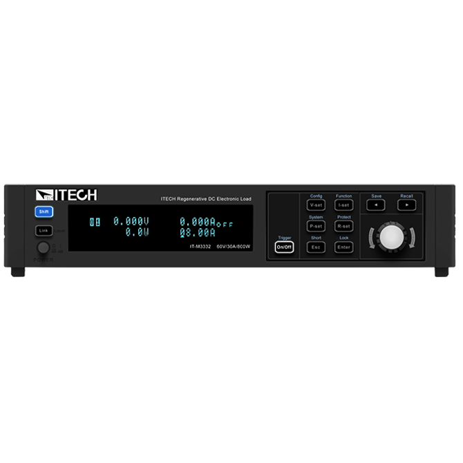 IT-M3300 回饋式直流電子負載既能模擬各種負載特性,又能將電能無污染的回饋電網(wǎng)。采用高功率密度設計,1/2U的體積內(nèi)可提供高達800W的功率吸收,靈活的模組式架構,可以滿足客戶的不同電流功率的測試需求。同時具備高精度的輸出和量測,并且針對測試做了多項安全設計,適合用于各種類型電池放電、多通道電源、半導體老化等多個測試領域。
