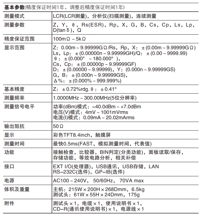 IM7580A包括:電源線 ×1, 測試頭 ×1, 連接線 ×1, 使用說明書 ×1, CD-R (通訊使用說明書) ×1